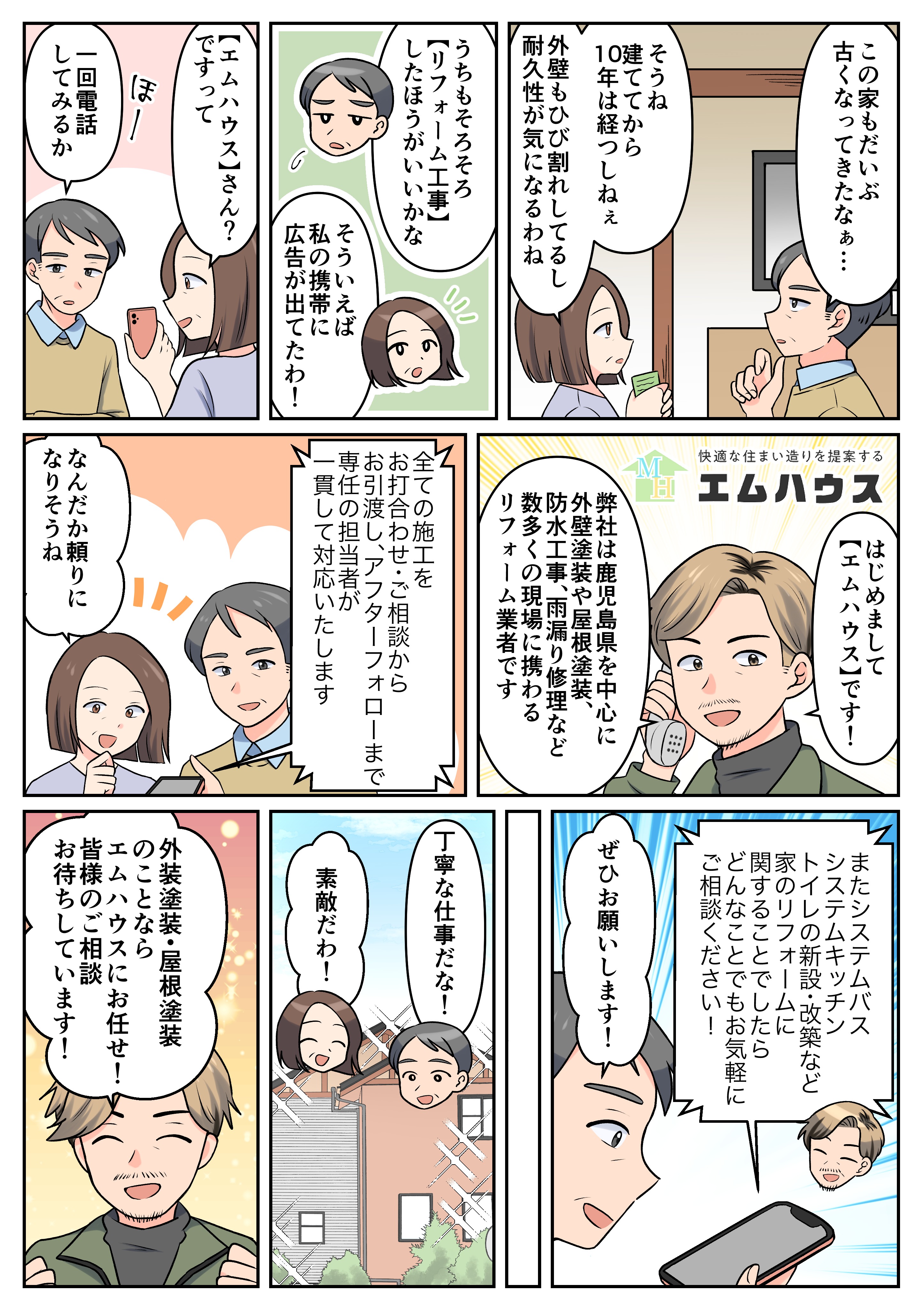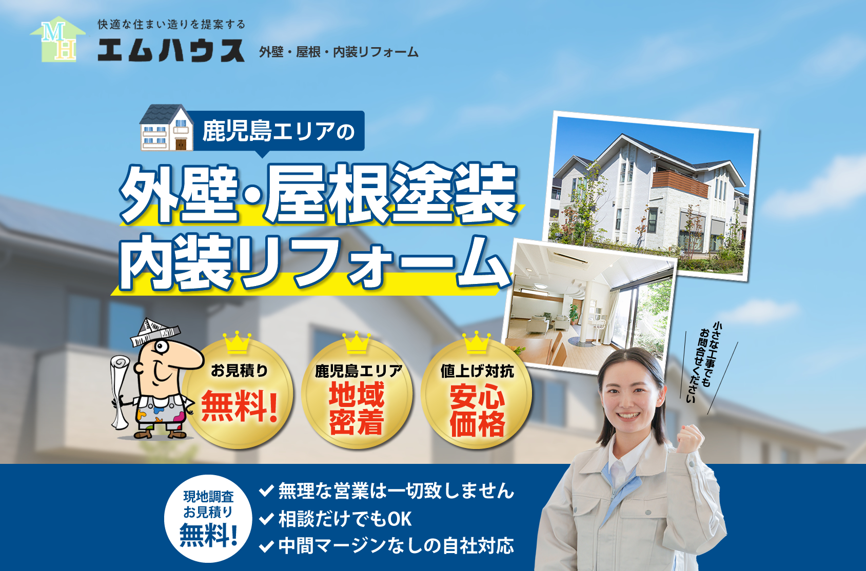 鹿児島市エリアの全域で外壁・屋根工事、リノベーションなどお住まいに関してはエムハウスにお任せください。外壁塗装から建具の調節や手すりの取り付けといった小さなご依頼まで幅広く対応可能です。ハウスメーカー様でお断りをされた内容も柔軟に対応しますので、まずは一度ご相談ください!